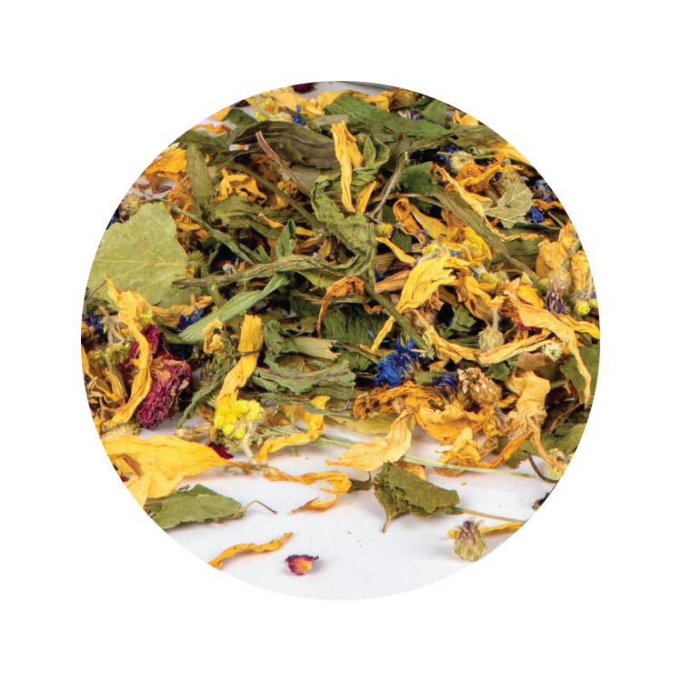 Ingredients: major plantain, ribwort plantain, apple tree leaf, ground elder, linden leaf, mallow herb, corn herb, birch leaf, chamomile herb, blackcurrant leaf, cornflower flower, rose petal, sunflower petal, helichrysum